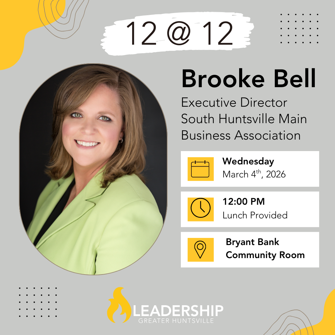 Join us for a 12@12 conversation with the new Executive Director of the South Huntsville Main Business Association, Brooke Bell!