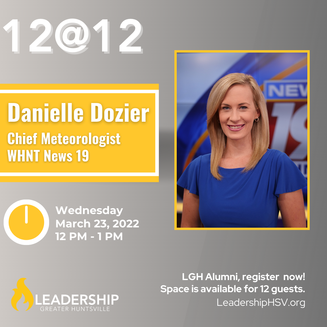 Join us for a 12@12 with the new Chief Meteorologist at WHNT News 19, Danielle Dozier. She will share with us about her career path in broadcast meteorology, some of the crazy weather she has tracked along the way, how she became a Chief Meteorologist and her leadership role with WHNT.