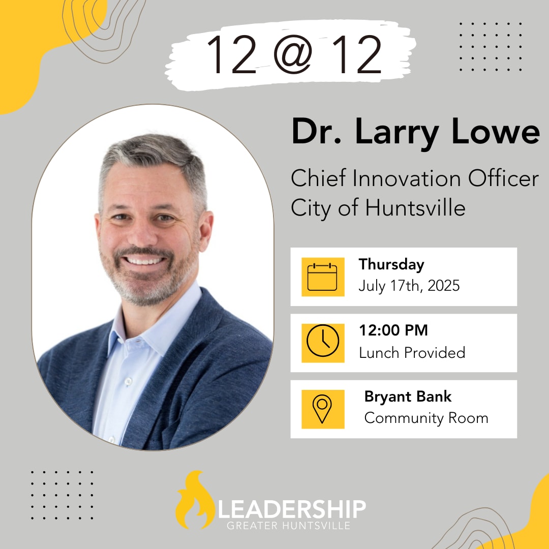 We’re excited to host Dr. Larry Lowe, the City of Huntsville’s first-ever Chief Innovation Officer, for an upcoming 12@12 conversation. A proud L-34 graduate, Larry has emerged as a local thought leader in the world of artificial intelligence, and we’re thrilled to see him step into this new role.