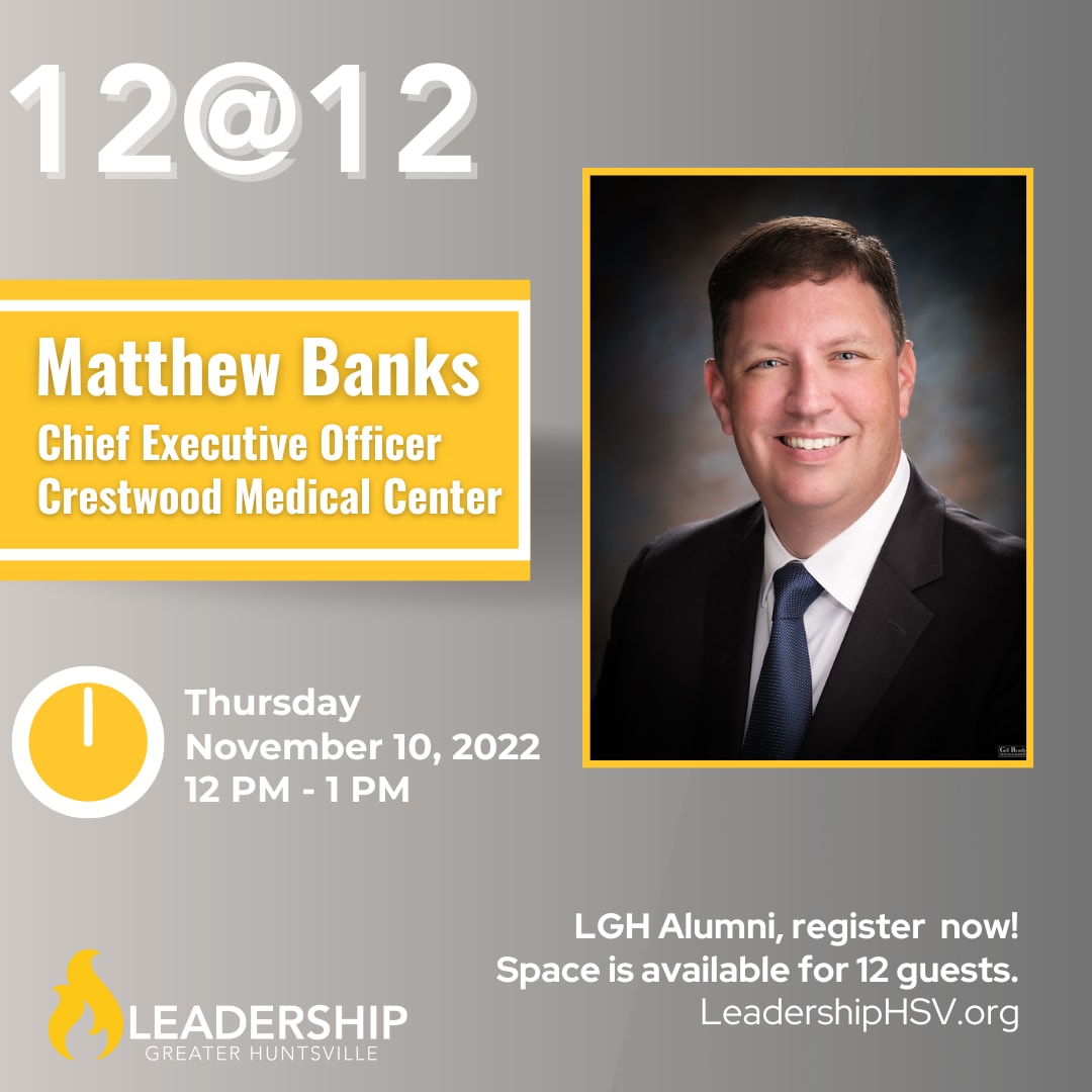 Join us for a 12@12 with Matthew Banks, the new CEO at Crestwood Medical Center. This event is open to only dues-paying alumni, and attendance is limited to 12 people.