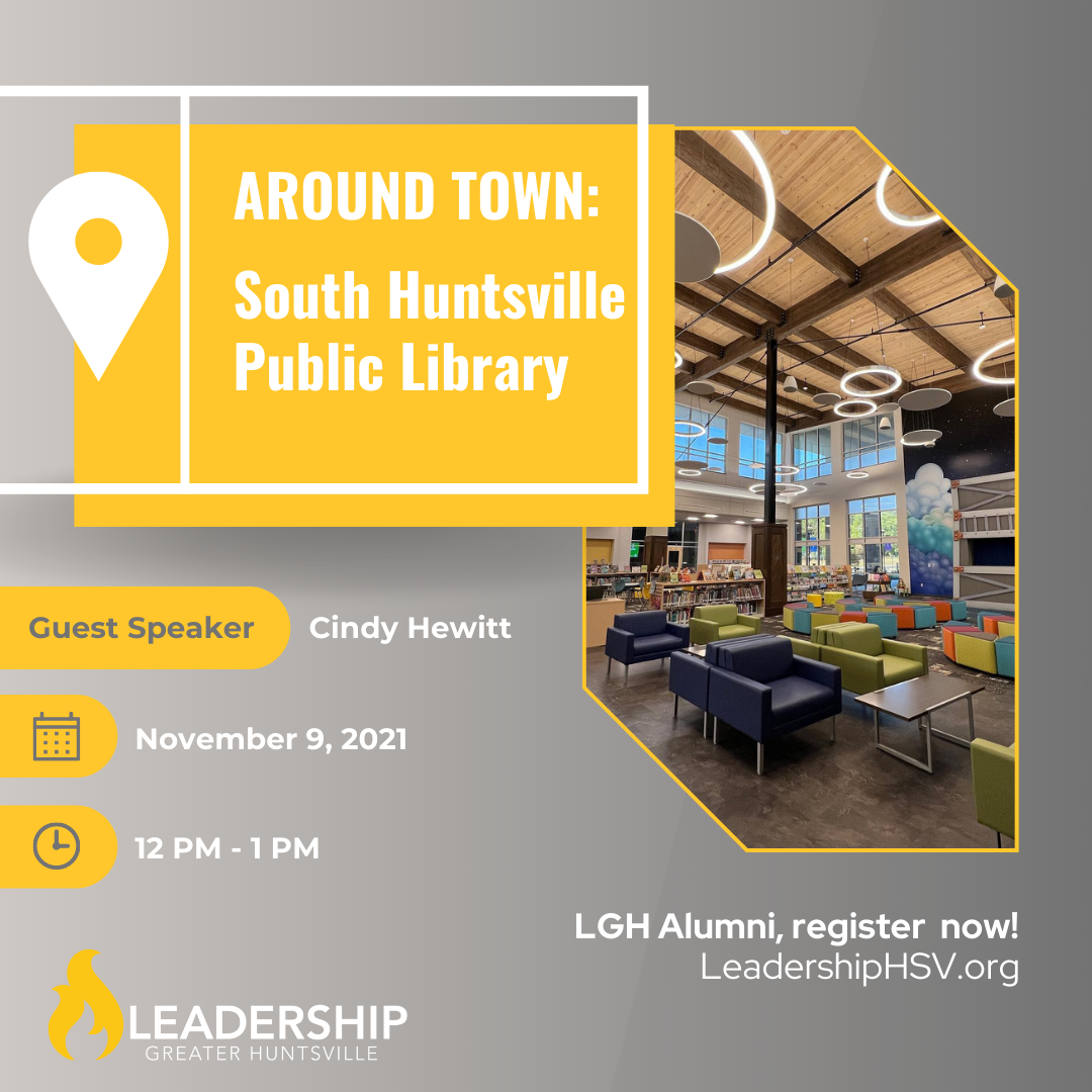 Join LGH Alumni for an around town at the new South Huntsville Public Library at the Sandra Moon Community Complex. We will take a tour of the new building with Huntsville Madison County Public Library Executive Director Cindy Hewitt. We will then have lunch together and have time for Q&As. Space is limited to 25 guests, so grab your spot now!