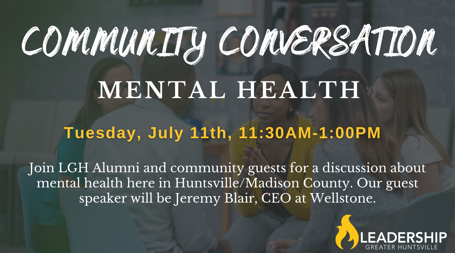 Join us for a Community Conversation about mental health here in Huntsville/Madison County. Our guest speaker will be Jeremy Blair, F-25, L-33, CEO at Wellstone. Jeremy will share with us an overview of Wellstone's different program and initiatives and share what challenges and new obstacles he is seeing in our community.