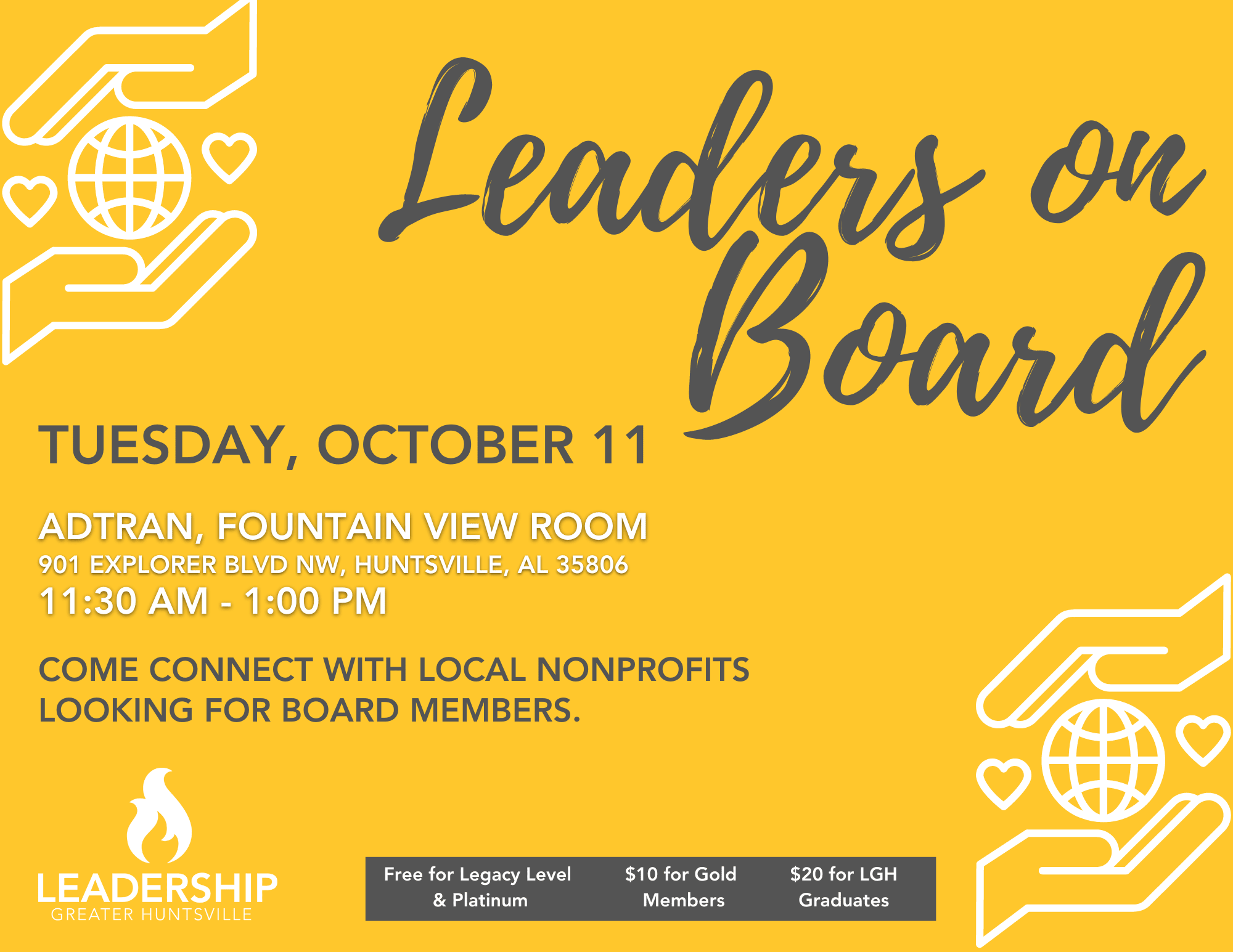LGH alumni and current class members, join us for a fall Leaders on Board event! This event showcases 15 local nonprofits that are looking to fill board positions and volunteer roles with their organization. Nonprofits participating will be announced soon!