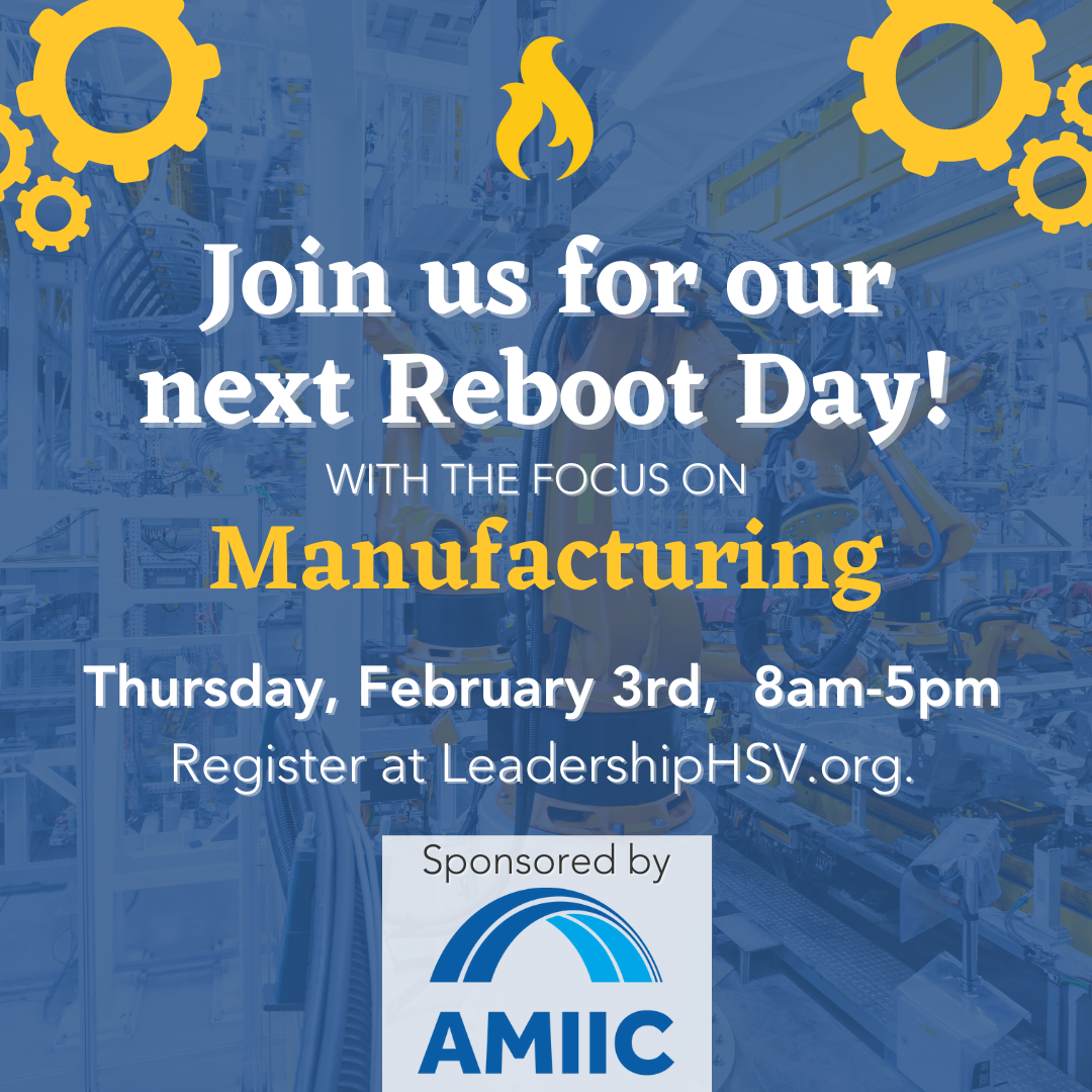 Join us for our next Reboot Day on Thursday, February 3rd. The focus will be on Manufacturing here in Huntsville/Madison County and the North Alabama region.