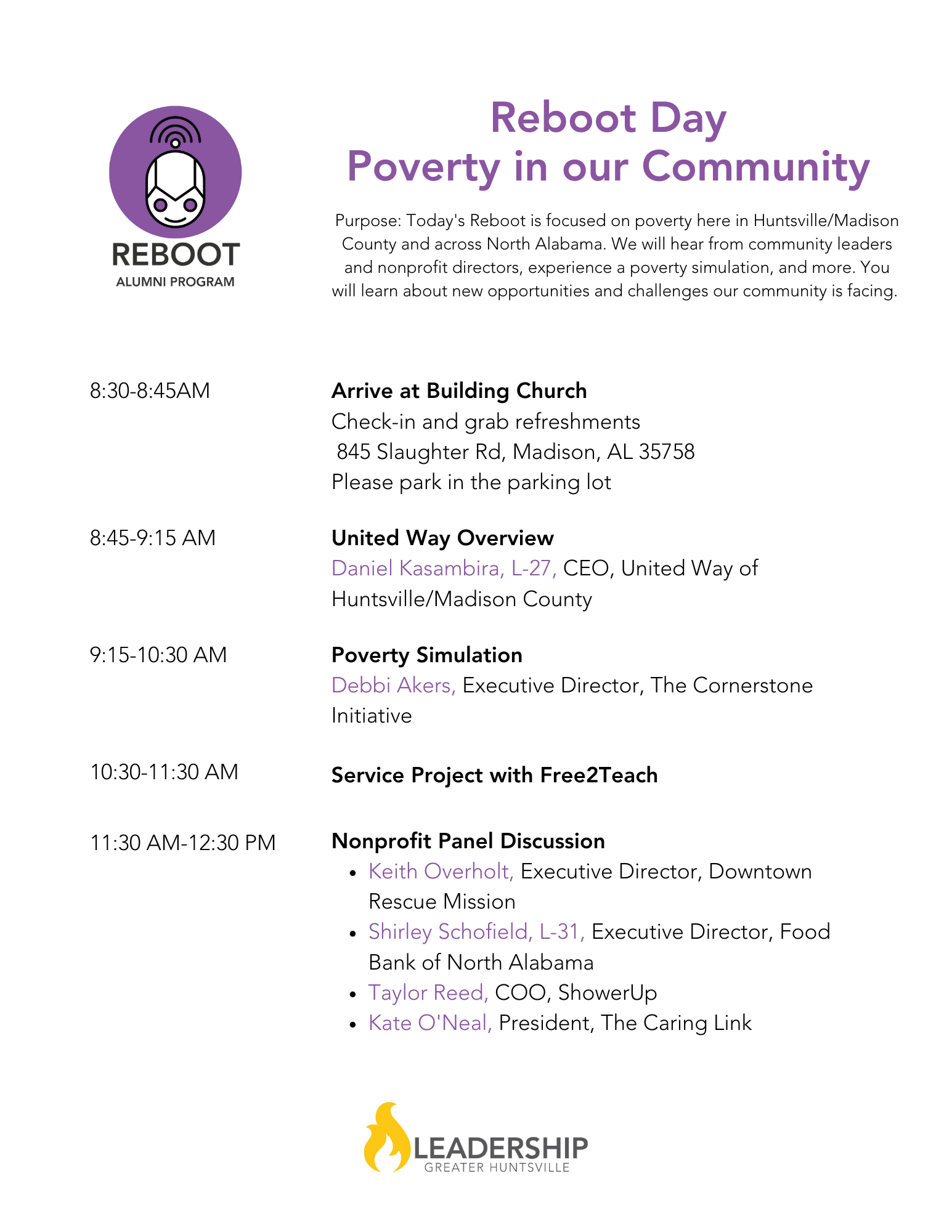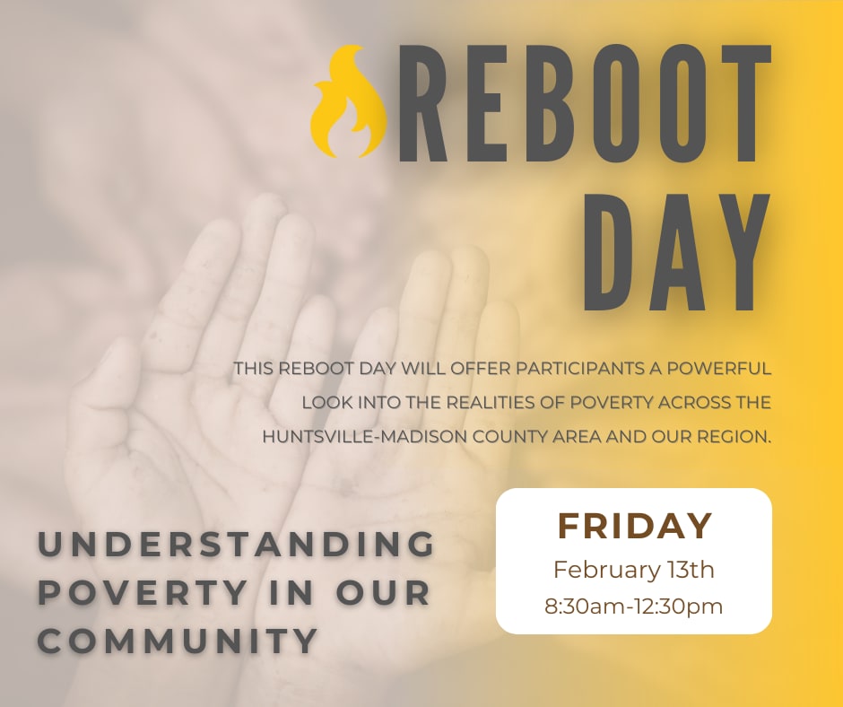 This Reboot Day will offer participants a powerful look into the realities of poverty across the Huntsville-Madison County area and our region. Through conversations with local leaders, hands-on learning, and immersive experiences, participants will gain a deeper understanding of the challenges individuals and families face, and the innovative efforts underway to break cycles of poverty.